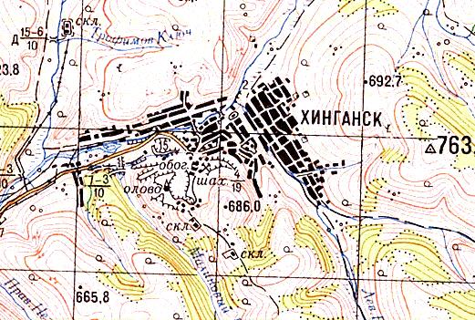 масштаба 1:100 000, изданной в 1971 году. Хинганский ГОК (предприятие «Хинганолово») производит добычу оловянных руд. Руда добывается в шахтах и открытым способом. Факт существования наземных участков узкоколейной железной дороги — под вопросом.