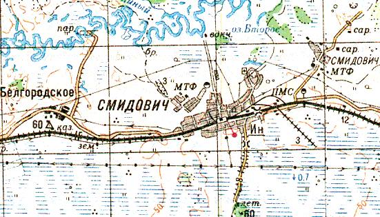 Узкоколейная железная дорога (?) на топографической карте масштаба 1:200 000. В некоторых топографических картах обозначена узкоколейная железная дорога (либо непроезжая дамба), расположенная вблизи ПМС (путевой машинной станции).