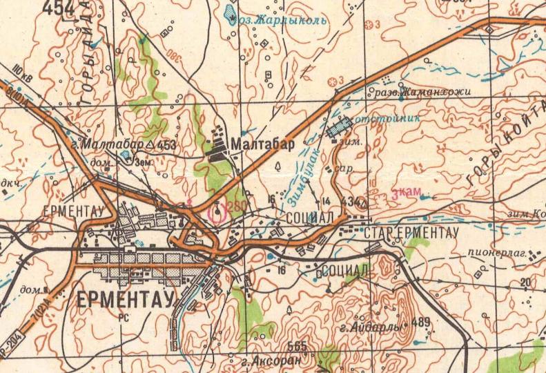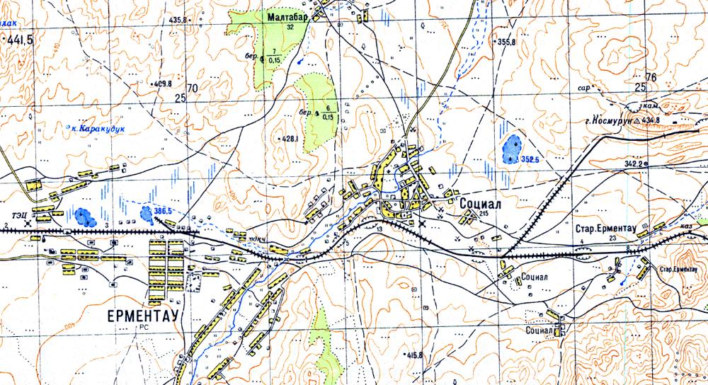 Район местонахождения узкоколейной железной дороги на топографической карте масштаба 1:50 000. В городе Ерейментау (прежнее название Ерментау) действуют шахты (предположительно по добыче урановой руды). Имеется действующая шахтная узкоколейная железная дорога.