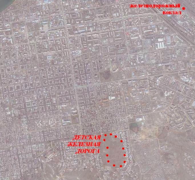 Детская железная дорога на спутниковом снимке (источник — «Google Maps»). Дата открытия Кокчетавской детской железной дороги — 1977 год. По информации от Д. Сутягина, узкоколейная железная дорога находилась вблизи пригородного посёлка Синегорье, и носила название «Синегорье».