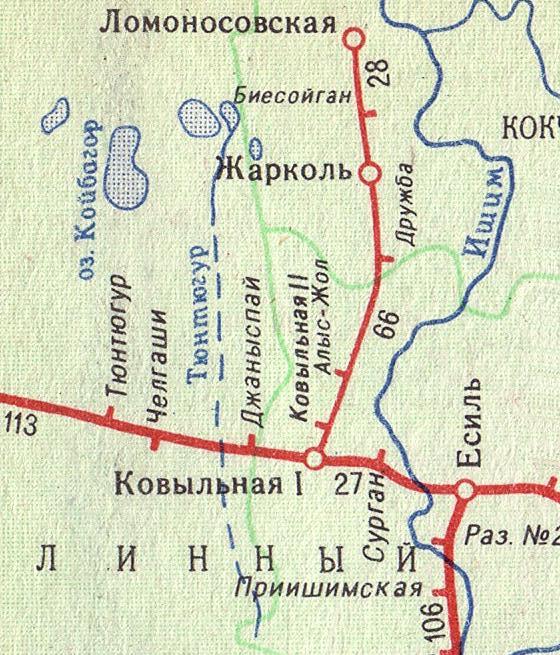 Узкоколейная железная дорога Есиль — Калачи (?). Возможный начальный пункт — город Есиль, расположенный вблизи узловой станции Есиль.