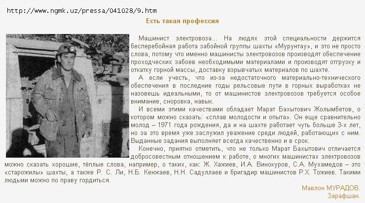 Материал, посвящённый машинисту электровоза М. Б. Жолымбетову. Материал был опубликован в 2004 (?) году