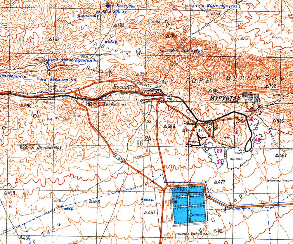 масштаба 1:200 000 (узкоколейные железные дороги не обозначены). Район местонахождения узкоколейных железных дорог в окрестностях посёлка Мурунтау на топографической карте масштаба 1:200 000 (узкоколейные железные дороги не обозначены)