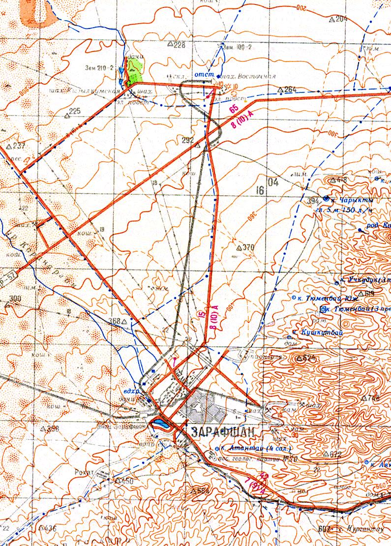 Район местонахождения узкоколейных железных дорог в окрестностях города Зарафшана на топографической карте